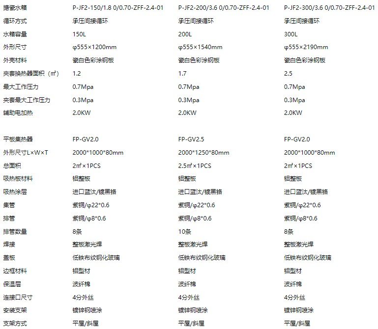 平板一體式太陽能熱水系統參數: