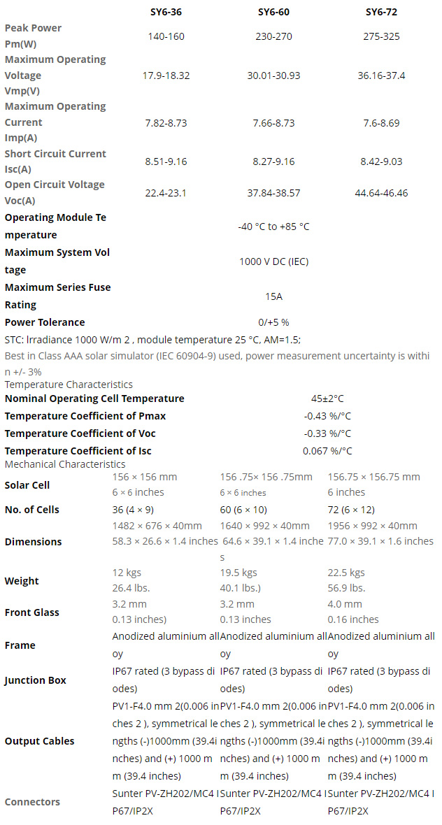 Monocrystalline Solar Panel Specifications